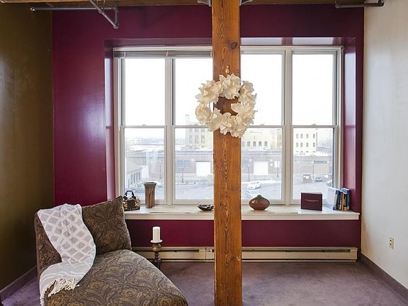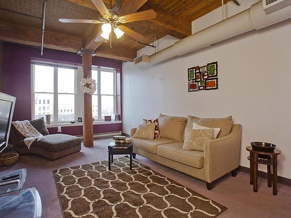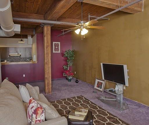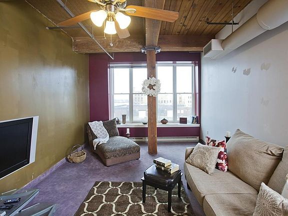Urban loft with fantastic open layout, spacious rooms, soaring exposed beam high ceilings and sweeping windows frame city views. A short excursion to nearby restaurants and cocktail lounges. Easy access to interstate arteries for travel commuting. Various urban amenities including local medical facilities and the nearby future casino. Many renovations done in June of 2017-all new red oak laminate flooring in hallway,living area, dining area and bedroom with new baseboards throughout the loft. New custom built european style slab cabinets with chrome pulls, new quartz counters with new granite sink basin and new faucet. All new ss appliances including new vent hood. New tub and surround. New bathroom vanity with granite top and all new faucets. New modern ceiling fans in living room and bedroom. New modern lighting throughout. The toilet although not new is insulated which means no sweating!