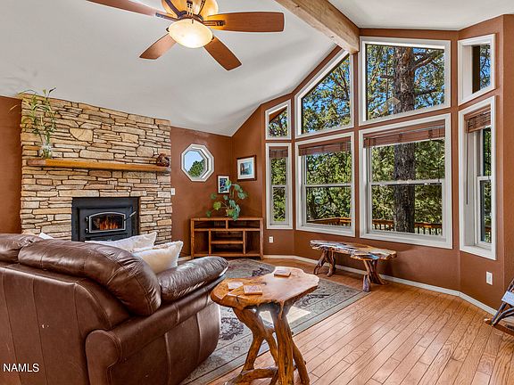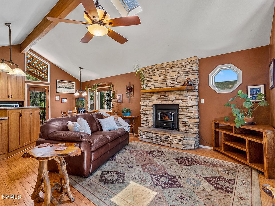 ~Welcome Home to the ''Tree House''~ Upon Entry Walls of Windows Greet You to Peer into Pined Privacy adorned by Oak Floors with a Skylight & Exposed Beam beneath the Vaulted Ceiling. The Inviting Open Concept offers Charm & Grace with the Living Areas & the Primary Suite on the Main Floor. The Lovely Kitchen is complete with Custom Cabinets, Granite Counters, Bosch Dishwasher, and even an Induction Stove for Healthy, Clean & Efficient Cooking. The 3 other Bedrooms, Second Full Bathroom, and Laundry Room reside in the Cool Basement where You can Walk out into the Awesome Backyard that Awaits. Located in the Revered Skyline Estates & just Steps to the National Forest & Mt. Elden Trails. Don't miss the Extra Storage Area under the Front Deck & the NEW Trex Decks in the Backyard.
