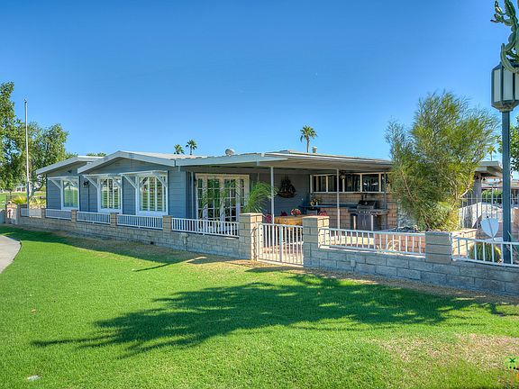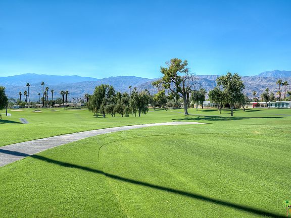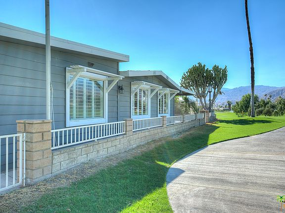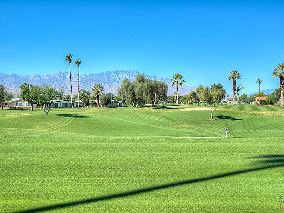 Gorgeous mountain view home is situated on the 18th tee! Enjoy the expansive patio with BBQ area as you enter.This 1688 square foot home shows light and stylish with an open floor plan. Over time tastefully upgraded and boost 2 bedroom, including the lovely Casita. The Casita has a golf view, a three quarter bath, refrigerator, sink and tiled floor and enjoy it's own private patio. The office and Master bedroom have newly installed light attractive carpet and throughout the home there are window shutters. The spacious living room, sitting area and dining room have light and beautiful manufactured hardwood like floors. Palm Desert Greens is an Active 55+ community where you own your land!. Amenities as Golf, Tennis, Pickleball, Saunas, Gym, Pools, Social Clubs. HOA fee includes; 16 rounds of Golf per month, Cable TV and Trash. Furnituring included in listing price!