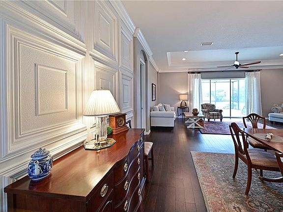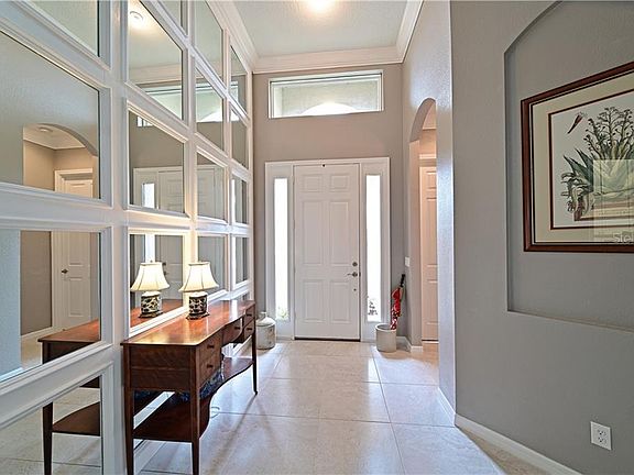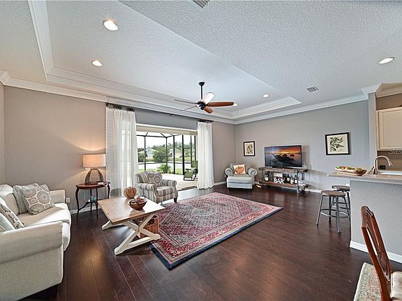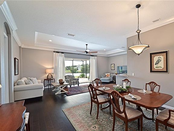 Why build when you can have a move-in ready home with wonderful enhancements. The 2017 Medallion Grenada model has a magical foyer with an extraordinarily high ceiling, mirrored and woodwork panels, which add to its appeal and uniqueness. In addition, the home is aesthetically attractive with double thick crown molding and upgraded floor molding. This home does not disappoint with a dining room for formal occasions complete with woodworking accents and proximity to a spacious centralized great room enhanced with a tray ceiling and engineered hardwood. The kitchen has a neutral palette complete with a large pantry, breakfast bar, and a breakfast nook for informal meals. When you enter the den/office area you'll be amazed by the rich, coastal appeal of ship lap and bamboo flooring complete with a built in desk. The master bedroom is a generous retreat with 2 large walk-in closets and an adjoining master bathroom with a large shower and double master sinks. The enlarged screened lanai area has a cool East exposure which extends the time you can spend outdoors. Come look at this fantastic 2017 built home conveniently located in the Cross Creek community near the I-75 and Fort Hamer thoroughfares accessing Tampa and Naples, and locally the UTC shopping and restaurant area and the 301 corridor. Not to be missed, Cross Creek offers its residents use of a resort style community pool, splash pad, dog park, playground, basketball court and several gazebos.
