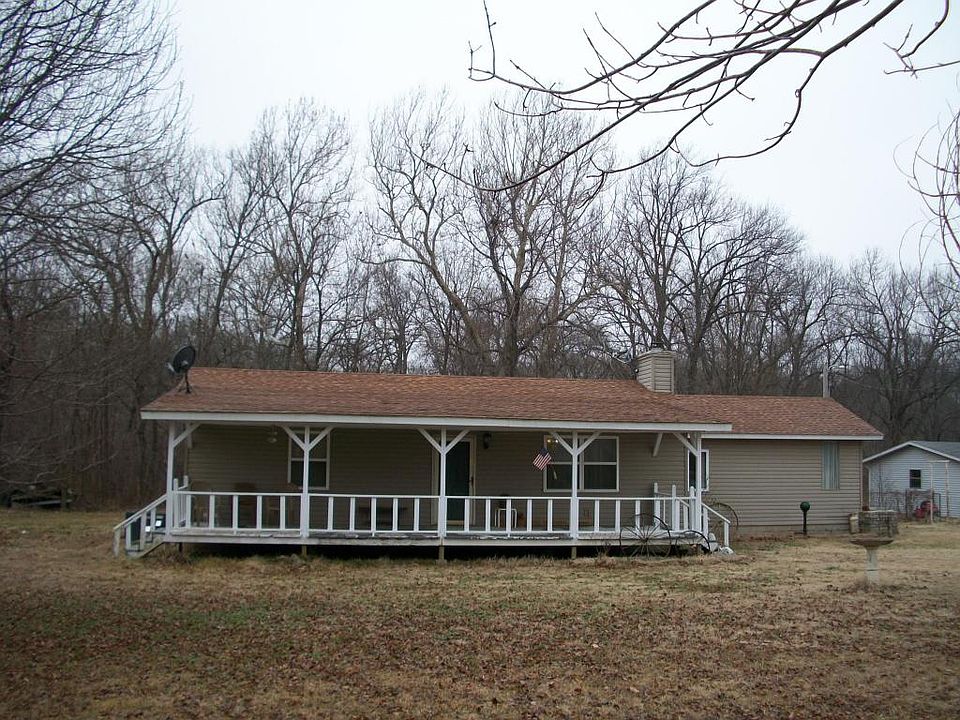 Home on 12 acres M/L close to Kansas and Missouri lines. The house is a 2 bed/2 bath home. Inside are 2 living areas, a fireplace, and open living and kitchen. There is also a 3 season room on the back. The acreage includes part of Little Five Mile creek and has a few acres cleared that could be used for livestock. There is a chicken house and a dog pen on the property.