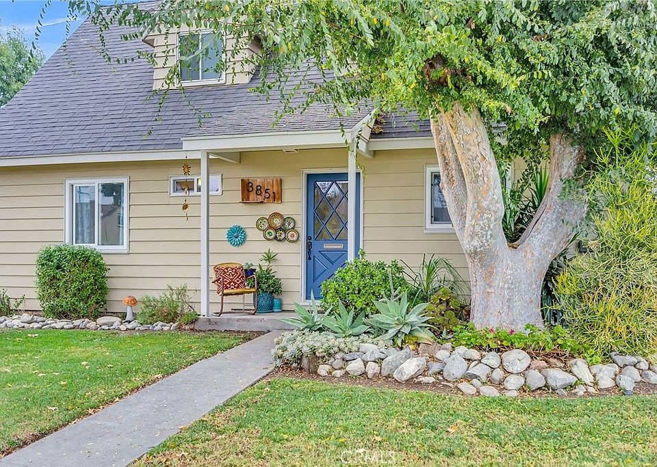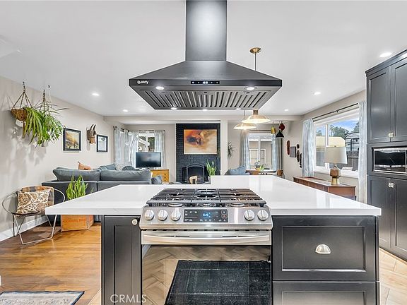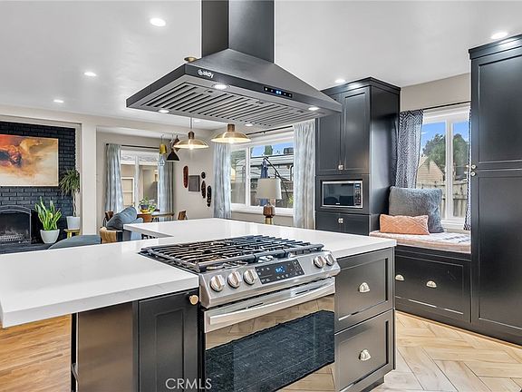 This quaint, cottage-style home has been updated with modern improvements while still maintaining the charm instilled in its original construction. Just inside the farmhouse-style door lies the completely remodeled custom kitchen. Topped with elegant white quartz counter tops, the custom black cabinetry provides a striking complimentary contrast throughout. Thoughtfully designed for presentation and function, the kitchen utilizes every inch of the kitchen footprint, integrating cabinetry along the wall spans and including a window bench seat. The center island with bar seating fans out to the adjacent family room, connecting the two spaces. The original wood floors, ample natural light, and a stately brick fireplace create a warm and inviting space to compliment the kitchen. The natural wood floors run down the first-floor hall to the recently remodeled bathroom. Highlights include a tiled shower stall, newer vanity, tile flooring, and a glass shower enclosure. Two bedrooms complete the first floor. Bathed in natural light, the primary bedroom is spacious with vaulted ceilings and the original wood floors. On the opposing side of the second floor, with no shared walls, is the fourth bedroom. Outside, the expansive yard is punctuated by a mature olive tree that lends its shade to the lawn below. A fire pit and covered patio offer options to entertain or relax. A harmonious blend of charm and modern living, this home is a must see.