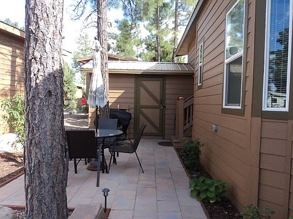 This resale home is in the 55+ summer community of Woodfield. A 1st generation Woodfield Retreat model, it features beautiful interior features such as shaker-style cabinetry, recessed lighting, a galley kitchen, plant shelves, wraparound hutch, built-in entertainment cabinet and built-in dresser bay. The upgrades include ceiling fans, 9-1/2' flat ceilings, an outdoor patio area, 8x12 shed with deep sink, washer & dryer included, and beautiful yard landscaping with irrigation and established perennials. This home comes with some furnishings inside and out! The sites at Woodfield are a comprehensive lease. We have simplified your summer living experience by rolling up most of your utilities into a fee paid just once a year. $3,900 annually covers your homesite as well as all of your water, sewer, trash service & internet. This allows you to save the costs of real estate taxes, HOA fees and year-round utility costs. Woodfield is a 55+ RV Resort and Park Model community located in the tall pines of Show Low, Arizona. As a seasonal community open May 1 - October 31 each year, imagine yourself enjoying the cool mountain air, shaded by the tall pines and watching the deer stroll through the forest, all while only one mile from major shopping, dining and state of the art medical facilities. An array of outdoor activities can be found nearby too.