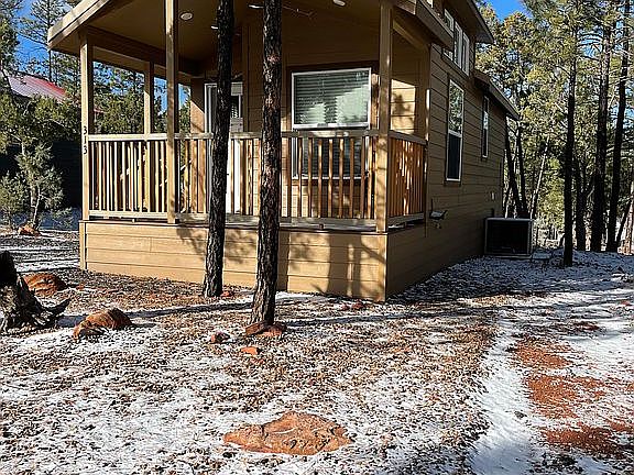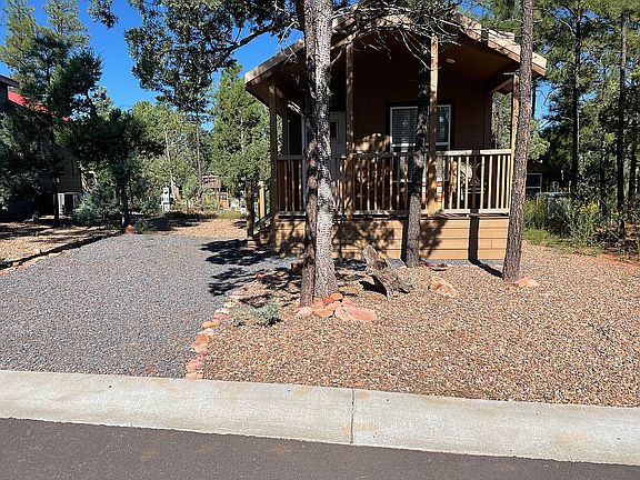 This resale home is located in the highly sought-after 55+ Woodfield community which is nestled amongst the tall pines with an abundance of fresh air and beauty. This resale home is the Woodfield Cabin model. It features a wider than usual living space that allows for a spacious living area. A large clerestory dormer pours the natural light into this gorgeous home. Other features include knotty alder cabinetry, recessed lighting, built-in dresser bay, side-by-side refrigerator, stainless steel appliances and kitchen sink, a craftsman-style front door, and a front porch to enjoy the cool mountain air. This home is sold furnished. The sites at Woodfield are a comprehensive lease. We have simplified your summer living experience by rolling up most of your utilities into a fee paid just once a year. $4,300 annually covers your homesite as well as all of your water, sewer, trash service & internet. This allows you to save the costs of real estate taxes, HOA fees and year-round utility costs. Woodfield is a 55+ RV Resort and Park Model community located in the tall pines of Show Low, Arizona. As a seasonal community open May 1 - October 31 each year, imagine yourself enjoying the cool mountain air, shaded by the tall pines and watching the deer stroll through the forest, all while only one mile from major shopping, dining and state of the art medical facilities. An array of outdoor activities can be found nearby too.