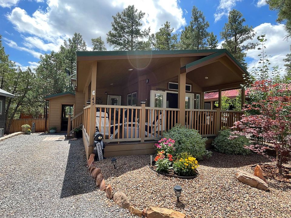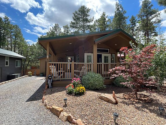 A beautifully appointed park model home that offers everything you need for comfort & convenience. This park model is 1 bedroom and 1 bathroom with a media room addition, extra large covered deck, and a shed for extra storage. The knotty wood cabinets and upgraded wood flooring give this home a mountain cabin ambiance. The kitchen includes a dishwasher, stainless steel apron-front farmhouse sink, and full tile backsplash. The landscaping offers stunning curb appeal. This home is located in the most highly sought after 55+ community in Show Low. The site is a comprehensive lease. Annual site fee covers the homesite as well as water, sewer, trash service & basic internet. This saves on the cost of real estate taxes, HOA fees and year-round utility costs. The community is a 55+ Park Model community located in the tall pines of Show Low, Arizona. As a year-round community you can enjoy all four seasons of the White Mountains, imagine yourself enjoying the cool mountain air, shaded by the tall pines and watching the deer stroll through the forest, all while only one mile from major shopping, dining and state of the art medical facilities. An array of outdoor activities can be found nearby too. The community's Rules & Regulations prohibit the use of the home as a rental.