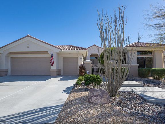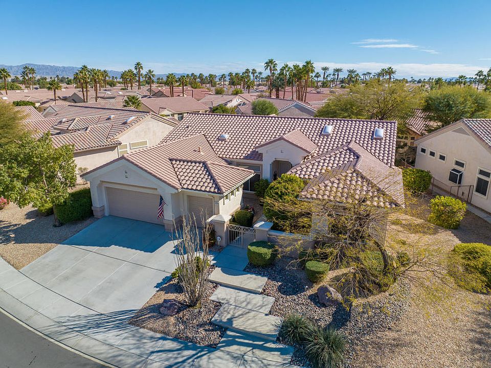 This beautiful Sun City Palm Desert Emerald floorplan w/gated front courtyard, consists of 2,185 square feet, 3 bedrooms, 3 bathrooms, large formal living and dining room w/12-foot coffered ceiling, great room w/built-ins, informal dining area, large kitchen island w/prep sink and tons of storage, pantry, and skylight. Large main master suite, master bath w/dual vanities, separate tub, walk-in shower, large walk-in closet, second master w/full bathroom, a separate laundry room w/storage and utility sink and newer AC! Low maintenance rear yard w/covered patio and plenty of room for your private pool and/or create your own desert paradise. Two car garage plus golf cart garage w/storage. The low HOA dues include cable/internet (Spectrum), 24 hour staffed entry, common area maintenance, the use of 3 clubhouses w/extensive social and recreational offerings, pools, fitness center, pickleball/tennis courts, two golf courses, and much more!