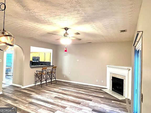 Welcome to this 2 Bdrm 2.5 Bthrm, end unit dream home! This beautifully designed property features a stunning brick front with elegant architectural elements, including expansive windows that allow an abundance of natural light to flow into the living spaces. 2 step entry into the foyer and hallway that leads you into the heart of the home. The first floor showcases brand new gray luxury vinyl plank flooring, stylish updated lighting fixtures that add a touch of sophistication and warmth. The open-concept layout has wide entry to the eat-in kitchen and a grand opening at the breakfast bar with view to the great room, dining space (optional) and view to the private patio an expansive level rear yard through the large sliding glass doors. The living area boasts ample square footage that is perfect for entertaining guests or cozy evenings with family. The kitchen is a chef's delight, equipped with sleek newer black appliances, stained wood cabinetry. There is room for a dinette set, or a portable kitchen island for added counter space and storage. Just off the kitchen, there is a cozy breakfast bar for connect with folks in the kitchen and great room, or using for a food serving bar for gatherings. The main and upper levels are bathed in natural light from the extra large windows, allowing great energy savings throughout the year. Each of the bedrooms offers a serene retreat with brand new gray blend plush carpeting and large windows that bring in fresh air and sunlight. The Owner's suite is particularly spacious and can accommodate a full suite of king size bed & furniture. It features a beautifully appointed ensuite bathroom complete with an glamorous updated vanity, a relaxing extra large & deep jetted tub to melt away the tensions of the day. You will appreciate the very large walk-in closet with room to add shelving units to customize, organize, and maximize the space. The additional 2 bedrooms are equally inviting and offer ample walk in closet space, perfect for all your storage needs. Those rooms that can serve as home offices, playrooms, or guest suites, tailored to meet your unique lifestyle requirements. The laundry closet includes a newer contemporary washer/dryer is conveniently located in the powder room on the main level. Outside you will enjoy the large private patio and expansive backyard with plenty of room for gardening, entertaining, or simply unwinding in your own private refuge. The patio is perfect for outdoor dining or lounging as you enjoy the scenic views of the surrounding landscape maintained by the Condo Association. This exceptional home also comes with essential amenities, including a designated parking area, and easy access to nearby facilities and parks, ensuring you have everything you need right at your fingertips. Don't miss this opportunity to own a slice of paradise that combines modern comforts with classic elegance. Copyright Georgia MLS. All rights reserved. Information is deemed reliable but not guaranteed.