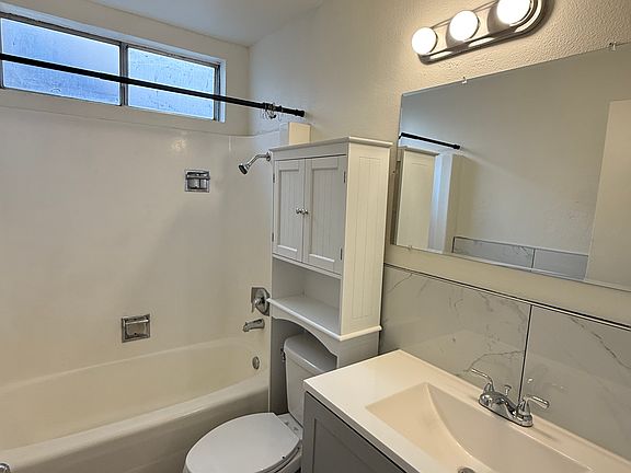Recently updated 2-bedroom, 1-bath apartment featuring a bright, modern kitchen with white shaker cabinets, stainless steel appliances, marble-style countertops, and wood-style flooring throughout. The bathroom offers a clean, fresh look with a new vanity, updated lighting, and a spacious shower/tub combo. This unit has great natural light and a functional layout perfect for everyday living. Conveniently located close to shops, restaurants, and major freeways.