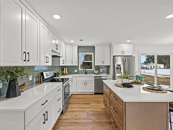 This ONE Level Brick Ranch IS The Total Package! Prepare to be floored by this top-to-bottom designer renovation where no detail was spared. This brick ranch has been reimagined for modern living, featuring a wide-open floor plan that flows into a drop-dead gorgeous kitchen. You’ll love the massive center island, sleek shaker cabinetry ~ deep storage drawers & farmhouse sink. The "star of the show" is the stunning designer backsplash that adds a sophisticated pop of color! Cozy up by the fireplace or retreat to the versatile flex room—perfect for an office, playroom, or an easy 4th bedroom conversion. The primary bedroom is a show stopper ~ Accent wall w/wood panel wall + a barn door w/obscured glass makes this space sparkle! Now featuring 2.5 luxurious baths, a massive double driveway, + a covered front porch made for rocking chairs. Nestled at the end of a quiet cul-de-sac with level, fenced yard!+ a spacious back patio. ALL NEW INSULATION. It’s not just a house; it’s a masterpiece.