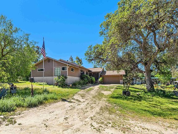 Settle into this serene country haven on 2.62 acres of flat, usable land surrounded by scenic mountains and mature oak trees. This ranch-style retreat offers 3 beds, 2.5 baths, and a layout filled with natural light and warmth. Step into the living room with vaulted ceilings and enjoy the charm of a wood-burning stove that separates the living and family rooms. The home features fresh interior and exterior paint, vinyl plank flooring, newer roof, and tankless water heater. The kitchen is equipped with a stainless steel fridge, a custom pantry, and ample counter space. The primary bathroom offers a soaking tub and separate shower. A laundry room with a half bath adds convenience while the two-car garage and additional shed add space for tools and gear. Outdoors, enjoy two garden areas, a front porch deck for morning coffee, and a spacious ground-level deck ideal for entertaining or taking in sunset views. You can keep horses (or continue to keep emus), enjoy the free roaming peacocks, start a chicken coop, grow flowers or food in the raised beds, and stroll among your fruit trees. With expansive open space, there’s plenty of room for ADUs, RVs, trailers, boats, or heavy equipment. Whether you're looking for a peaceful full-time residence, multi-generational living, or a flexible rural retreat, this property offers privacy, possibility, and country living just a short drive from San Diego.
