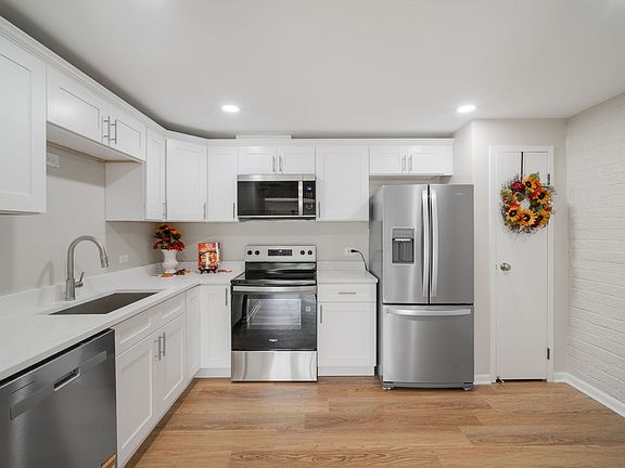 Prepare to be impressed with this freshly updated unit - from new vinyl tile floor throughout, to a kitchen that features all new SS appliances, new white cabinets, quartz countertops, crown molding, farmer like sink, canned ceiling lights, new cabinet hardware,raised ceiling and with an eat in kitchen. Full bathroom features a new vanity with quartz countertop, new light fixture/hardware, commode & its own linen closet. Good sized bedrooms have closets with new six panel doors and blinds. Entire unit has been freshly painted and boasts of a 3 year old A/C unit. The common area includes coin operated washers and dryers in the laundry room. Every unit comes with it's own storage locker. A swimming pool is on the premises, with a party room and grill available for use. Parking is included. No restrictions on renting, can be rented immediately. Complex is conveniently located near I-294, shops, LA fitness center and other amenities. Easy to show. Why rent when you can own this lovely unit. Ideal for investors & cash buyers