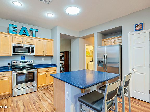 Sought-after Holiday model on a N/S facing cul-de-sac lot. Perfectly flowing layout w/ spacious living areas featuring a soothing palette & wood-look vinyl flooring. New carpet in bedrooms. Kitchen has BRAND NEW SS appliances, extended counter w/ extra cabinet storage & large island w/ breakfast bar. The kitchen opens to the dining area, creating the perfect space for entertaining. Fridge, washer, dryer convey. Freshly painted owner's suite w/ en-suite bathroom is complete w/ custom soft-close cabinets, vanity, mirror & lighting. Ceiling fans & upgraded lighting fixtures throughout. Backyard is very private w/ an extended patio for extra seating. Garage features epoxy flooring & built-in cabinets. Soft water system. Newer AC!(2020) Close to Anthem amenities, dining, shopping & I-17 access.
