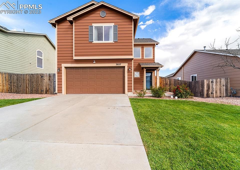 Welcome to 3857 Tahoe Forest Lane, nestled in the picturesque Cuchares Ranch! This 2-story haven boasts pure charm, making it the perfect canvas for your next chapter. Step into a world of modern comfort as you enter the open-concept main level. The stage is set with gleaming new LVP floors that flow through the main level. The heart of this home is undoubtedly the bright kitchen, complete with an inviting island that's not just for prepping culinary delights but also creating memories. The kitchen unfolds seamlessly into the dining and living area, creating a harmonious flow that's perfect for entertaining friends or simply enjoying a night in. And yes, there's a convenient powder bath on the main level. Step outside to an outdoor oasis and imagine lazy Sundays surrounded by lush green grass in your large, fenced backyard, a perfect canvas for BBQ parties, furry friends, or just some well-deserved sun-soaked relaxation. As you ascend upstairs, your toes will sink into the sumptuous luxury of brand new Stainmaster carpet; enjoy peace of mind with the transferable warranty that comes with it! Discover the magic of the primary retreat with Mountain views out the West facing window. Enter through a custom barn door into your private haven; the ensuite bath is a spa-like escape, featuring a generously sized soaking tub/shower and double vanity. Let's not forget the walk-in closet, your personal gateway to organized bliss. Across the hall two additional bedrooms await your creativity and personal touch, offering the flexibility to transform them into inviting guest rooms, inspiring home offices, or vibrant play spaces for the little ones. A spacious laundry room completes the upper level with a bright window showcasing another spectacular mountain view. 3857 Tahoe Forest Lane is not just a house; it's a story waiting to be written. Your story. So, pack your dreams and make this Colorado Springs gem your home sweet home!