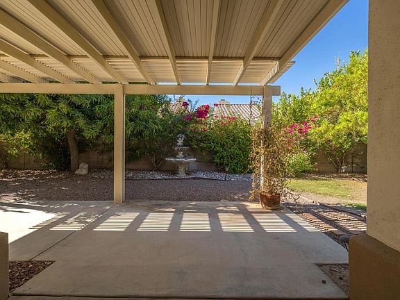Sun City Palm Desert - Emerald. Located a short distance to the Mountain View Clubhouse, this estate model home has a spacious rear yard with lush landscaping, an extended patio and an alumawood patio cover. A gated front courtyard and double door entry provide curb appeal. Dual AC new in 2019. Inside, 12ft coffered ceilings are in the foyer and greatroom. 10ft ceilings are elsewhere. Shutters are on most windows. The greatroom has a slider to the rear patio. The upgraded kitchen has slab granite counters and backsplash, stainless appliances including double wall ovens, a large chef's island with breakfast bar and pendant lighting and a skylight. The primary suite has a bay window and large walk-in closet with mirrored doors. The primary suite bathroom has dual sinks, a stall shower, oversized tub, sitting vanity and skylight. The extended guest suite has French doors to the courtyard and a tub/shower in its bathroom. The 2nd guest suite has a skylight in its bathroom along with a tub/shower. The laundry room has a utility sink and built-in storage. The 2+ golf cart garage has built-in storage and an epoxy floor.