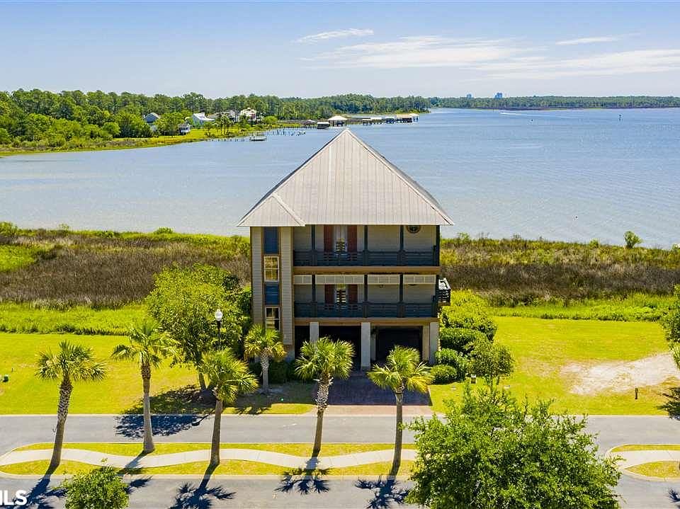 Enjoy amazing views of Oyster Bay and the Intracoastal Waterway from almost every room of this gorgeous home in gated Sunset Bay at Bon Secour. This immaculately maintained residence offers four bedrooms, four and 1/2 baths, a wine cellar, oversize two car garage, 10' ceilings, 8' solid pine doors, an elevator, custom cabinets and a gas fireplace with granite facing. There are large decks on both the east and west sides for enjoying the amazing sunrise and sunsets. The kitchen offers a gas range, ample antiqued cabinetry, stainless steel appliances including new refrigerator & an imported slab counter top. The main living area, master suite and baths all feature 20 porcelain tile flooring with the third level carpeted including bedrooms. The master suite offers custom black out drapery, its' own stack washer/dryer, jetted tub, separate shower and two large closets including 1 walk-in. The third level also features an additional stack washer/dryer and two of three guest bedrooms offer en suite baths. This magnificent property will convey furnished and includes a large boat slip #72 in the private marina. Sunset Bay amenities include a clubhouse with fitness, library and pool as well as being on secluded Plash Island but only minutes to beaches restaurants and shopping.