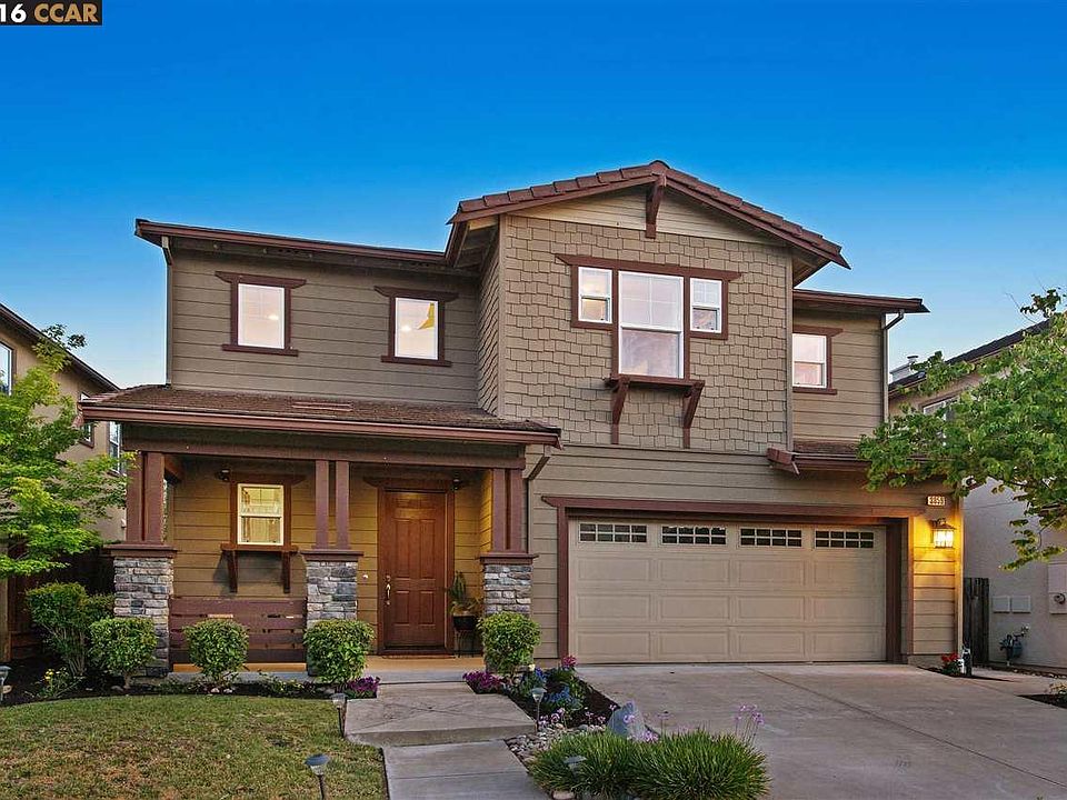 Fabulous Windemere home, exceptional backyard, located walking distance to schools Boasting hill views, the pleasant front patio welcomes you to this spectacular home featuring 4 bedrooms, 2.5 bathrooms and +/- 2,246 square feet of flexible living space. The elegant formal dining room offers soaring high ceilings, plantation shutters and custom lighting. The beautiful chefs kitchen boasts granite countertops with a gorgeous full backsplash, center island and recessed lighting. Fabulous built-in appliances include a five burner gas stove, microwave, oven and dishwasher. A casual dining area features a walk-in pantry and a sliding glass door leading to the delightful backyard. Relax in the comfortable family room offering a fireplace with granite surround, plantation shutters, ceiling fan, built-in media niche and surround sound speakers. The main floor powder room boasts hardwood floors and a charming pedestal sink. Venture upstairs to the master bedroom suite highlighting plantation shutters, neutral carpet and a ceiling fan. The master bathroom ensuite boasts dual sinks, tile countertops, walk-in shower and a soaker tub with jets. A mirrored walk-in closet with custom built-in organizers provides an abundance of storage space. Three additional bedrooms offer plantation shutters, a ceiling fan, neutral carpet and a closet. A centrally located full bathroom features dual sinks and a shower over tub combination. The oversized backyard offers beautiful landscaping and a slate patio with plenty of space to entertain family and friends. Additional highlights include a water softener and a finished two car garage with built-in cabinetry. As part of the Windemere community you will enjoy wonderful parks and recreation as well as be within walking distance to top rated San Ramon Valley schools.