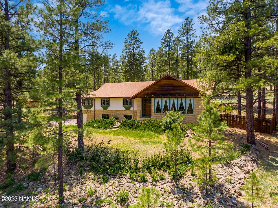 This beautiful home with 2 primary suites with bonus rooms on the main level sits on almost an acre, backs BUFFALO PARK, & has access to forest service land. The living room has soaring ceilings with wood beams, gas fireplace, hardwood floors & a wall of windows with views of Mt Elden. The kitchen opens up to a large family room with a window seat. You will love the library/office w/ mahogany wood paneling that is tucked into the family room. There are 2 large primary suites each with sitting rooms/ office/ yoga studio/ or nursery, you decide! Relax in the extra large sunroom. 1 add'l bedroom on the main level with updated bathroom. Don't forget to take a peek at the 3rd floor bedroom. Downstairs walkout basement is 1,231 sq feet with so much potential for add'l living spaThere is plumbing in the basement for an additional bathroom. The 4 car garage plus huge workshop is perfect for all the car enthusiasts and handymen.