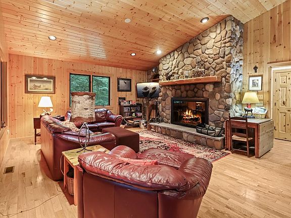 Romantic field stone fireplacePanoramic viewTwo lg bedroomsWood interior wallsFront wrapping screened porchQuality wood floorLong private road