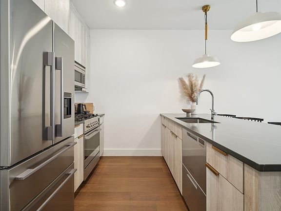 Beautiful NEW Construction (2022), Elevator Bldg. in a fabulous Downtown Jersey City location. Residence 402, is a high floor, large 1 bedroom, 1 bath designer driven home with beautiful fit and finish. Top of the line chef's kitchen featuring Fisher & Paykel s/s appliances including gas range, double drawer dishwasher, micro, french door refrigerator, stunning ash quartz countertops, and top of the line cabinetry. Spa like bathroom with tub/shower, oversized anthracite trim windows flood the home with light, in-home full size washer dryer, wide plank hardwood floors throughout, LED lighting, sleek brass door hardware, and stylish fixtures! Outside your front door all great restaurants (Prato, Jane Doe, Madame Claude, Gussy's, Cellar 335, etc.) shopping, nightlife, and the Grove St. PATH is right up the street!