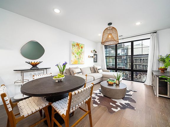 Welcome to a truly distinctive opportunity in the heart of Downtown Jersey City an exceptionally versatile residence offering the rare potential for three separate living or work from-home spaces. Nestled within a boutique, elevator-serviced building completed in 2022, this expansive two-bedroom plus den home seamlessly blends contemporary design, premium finishes, and thoughtful functionality. Step inside to discover wide-plank hardwood flooring that flows effortlessly throughout the home, beginning with a custom-designed Elfa entry closet and a flexible den ideal for a home office, studio, or guest space. The secondary bedroom is generously proportioned, featuring bespoke Elfa closet systems and tailored window treatments. The home's open-concept living and dining area is an entertainer's dream, anchored by floor-to-ceiling window walls that flood the space with natural light. The adjacent chef's kitchen showcases full-slab Glacier Grey quartz countertops, Fisher & Paykel stainless steel appliances including a gas range, double-drawer dishwasher, and French door refrigerator complemented by custom natural hardwood cabinetry. The serene primary suite offers a private retreat with its custom walk-in Elfa closet, elegant window treatments, and a spa-inspired en-suite bathroom with floating vanity and luxurious stone tiling. Additional features include central HVAC, energy-efficient LED lighting, and an in-unit full-size washer and dryer. Residents enjoy secure building access, a dedicated bicycle room, and convenient package valet service. Located just steps from the vibrant energy of Grove Street and its PATH station, you're only minutes from Manhattan, and surrounded by Jersey City's top restaurants, cafes, and cultural hotspots. This is modern city living redefined.