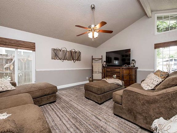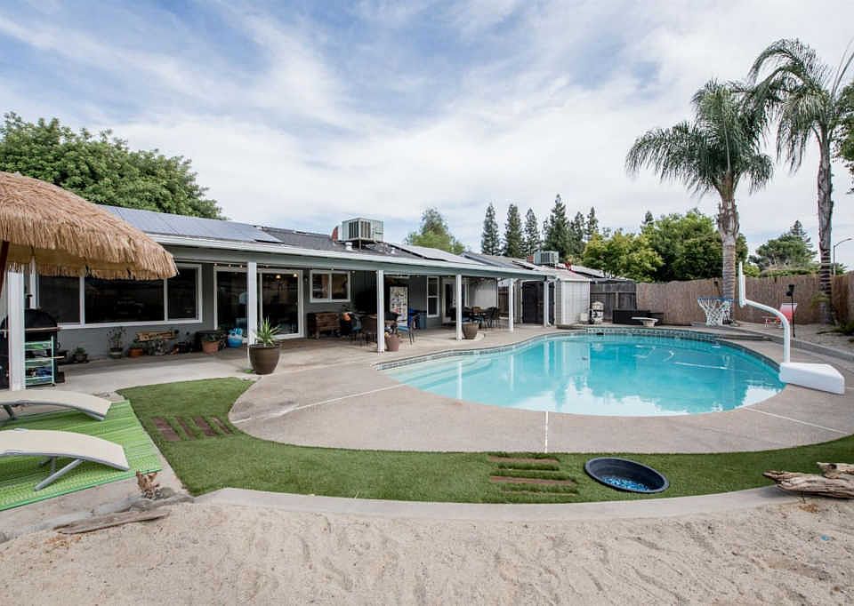 Ready for the beach? Welcome to the beach house of Clovis! The coastal inspired backyard features a large pool w/ energy efficient pump, palm trees, 50ft covered patio w/ sunshades & 8 tons of sand to create a beach style area that is sure to make anyone excited for summer. This beautifully updated home is located in a quiet cul-de-sac conveniently near food of all sorts, Starbucks, Clovis High, GB3, Sierra Vista mall & quick freeway access. Close to 1900 SqFt of living space allows for 4 bedrooms 2 baths plus a cozy family room w/ vaulted ceilings & a bright living room w/ large picturesque windows overlooking the beach-yard. An open concept between the modernized kitchen & living room is perfect for entertaining or keeping an eye on the kids. The large master bedroom features a walk-in closet, ceiling fan, updated bathroom & French doors. Powering this home is cost-effective, due to the OWNED solar system that's included. PG&E bill est $40 in the midst of summer (per seller). Enjoy!