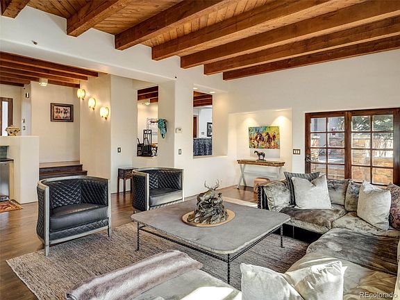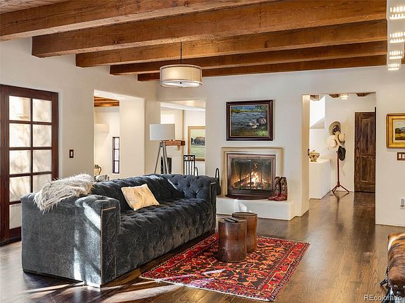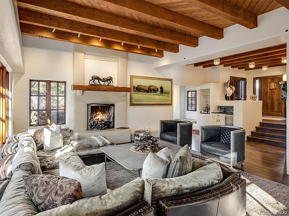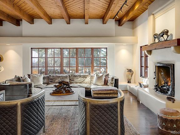 Stunning southwestern one of a kind custom home in one of Castle Pines most beautiful settings. Located on a three home cul de sac with sweeping driveway and open space behind the home. This incredible custom home has the trees and gardens to compliment its exceptional architecture. With patios, rooftop decks and meandering trails through the scrub oak on this large lot, you are able to enjoy the waterfall along the driveway as well as the overflowing gardens. Remodeled to perfection and comfort with new hardwood floors, new paint, huge windows and doors that open to private outdoor areas. The exposed beams and authentic touches add to the ambiance of every room. The remodeled gourmet kitchen has new appliances, a cozy kitchen nook and doors to another patio. Experience all seasons equally with both wood and gas fireplaces. The Huge remodeled finished basement with additional ensuite, has new flooring two family rooms and entertainment area. Enjoy your oversized primary suite with a sitting area, fireplace, private balcony, remodeled primary bathroom and closet. Everything about this house is incredible!