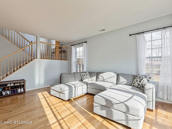 FABULOUS Raised Ranch! End unit townhome with 1700+ sq ft of space! This home has it all with a large open light and bright open concept to both the upstairs and downstairs living spaces. Rooms featuring a gas log fireplace upstairs in a spacious living room with hardwood flooring, gorgeous windows and a deck/balcony. All this open with the dining room and island kitchen. Which was updated in 2021, black SS appliances, quartz counters, tile flooring, custom backsplash, pantry. A wall was taken out and the new design gives you a much more open feel. Master Suite impresses with a walk-in closet and luxury bath boasting dual vanities, whirlpool tub and separate shower. The walk-out lower-level family room also features hardwood flooring and has sliders to a nice patio and plenty of green space. A 3rd bedroom and a full bath on this level make it perfect for a teen suite or in-law arrangement. Desirable Algonquin Lakes Community with amenities galore: Near the Elementary School, parks, playground, walking/biking path, frisbee golf, the Fox River and so much more....