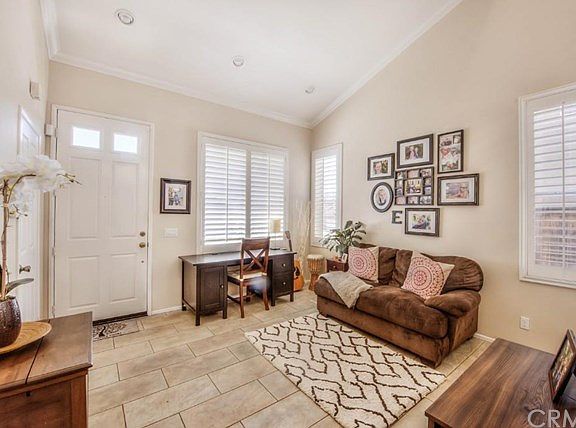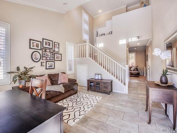 Located in the hills of Orange in The Village Community among a peaceful natural setting, this three-bedroom and two and one-half bath home is characterized by a comfortable flowing floor plan and elegant amenities. With a welcoming approach, soaring ceilings grace the formal living room while beautiful ceramic tile flooring, custom designer paints, crown moulding, recessed lighting, and plantation shutters flow throughout the home. Floor to ceiling windows flood the interior with natural sunlight and bring the outdoors inside. With beautifully-finished with custom cabinets, granite counters, decorative tile back splash, stainless appliances, and a dining area, the bright kitchen is a focal point in the home and opens to the spacious family room, warmed by a fireplace and ideal for entertaining. Enjoy al fresco dining in the backyard with picturesque backdrops of the surrounding hillside and city light views, a covered patio, lawn and flourishing gardens. Enjoy the association pool, and nearby parks and walking trails, restaurants and services. Take pleasure in all this charming home has to offer.