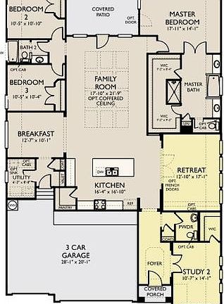 Popular one story plan with a chef's kitchen featuring upgraded cabinets, quartz countertops, built-in oven, gas cooktop, walk-in pantry, and a center island open to the family room. Large sliding glass doors in family room. Luxurious master suite with a private bath including a garden tub, oversized shower, double vanities and a walk-in closet. Spacious retreat area located off the kitchen. Private study. Covered patio on back of home perfect for outdoor relaxation. Three car garage.