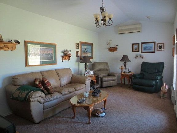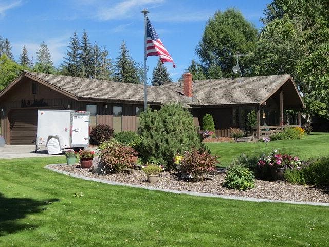 One of a kind one level home in Groveland! You'll be amazed by the park-like private setting a short distance from town w/a lovely view of the mountains located on the bank of a canal, just like it was located near a stream in the summer! Facing south is a covered porch so you can sit and enjoy the view, inside you'll find a large oak kitchen w/custom tile flooring & backsplash and dining room with new laminate flooring & a free standing wood stove. There is a cozy living room that was built on the back w/access to the yard via patio doors, this room is heated & cooled with a ductless electric unit. There are two bedrooms and 1 full bath w/tile flooring and tile surround. The bedrooms & living room has brand new carpet! Off of the master bedroom is an cozy sitting room w/warm wood tongue & groove walls & ceiling, access to the front porch and a view of the canal & mountains. Between the home & the double garage is a great tiled mud room/den w/storage closet & laundry facilites. Garage has garage door openers & a workshop area full of work benches for all your tools & projects. Outside is a drop dead gorgeous yard w/sprinkler system, a bully barn, perfect flower beds surrounded by concrete curbing & brand new rain gutters. Septic was just pumped. No showings 9/29 to 10/8.