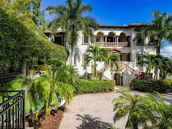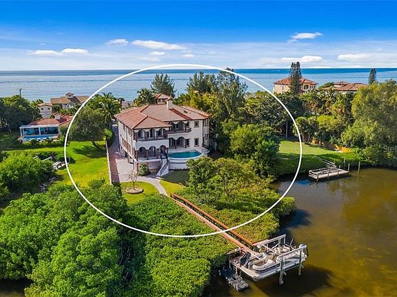 Stunning Bayfront gated masterpiece built in 2006 and located on Casey Key in Sarasota one of the most exclusive barrier islands on the west coast of Florida. Modeled after an 18th Century Tuscan mansion all of the finishes were imported and many were hand carved, including the wooden doors, cabinetry, stone columns and even the stone sinks. The European style Interior Grand Courtyard greets you with a 26 foot illuminated beamed ceiling and a 12 foot hand carved stone fireplace plus expansive views of the Infinity Pool, dock, Little Sarasota Bay and the Intracoastal Waterway beyond. The spectacular kitchen and family room are very inviting with gorgeous hand carved wooden cabinetry, a gas stove, large walk-in pantry, multiple dishwashers, three sinks and the same expansive bay views. The elegant Outdoor Pool-Side Family Room with a hand carved stone fireplace and framed in beautiful hand carved stone columns might be your favorite room of the house to relax, especially on those chilly Florida nights! The main house is serviced by an elevator on all three levels, there are four bedrooms plus a handsome library/office, the flooring is stone and imported wide plank wood flooring throughout the residence. The Master Suite is fabulous with well-appointed his and hers private bathrooms, a beautiful closet, and a large bedroom opening to a sunset terrace. The west and east upper promenades both offer large terraces for relaxing or just enjoying the Gulf breezes. The outdoor living area is sensational with the infinity edge pool, outdoor fireplace and expansive outdoor living space, plus the dock! The dock features a 10K boat lift plus there are two jet-ski docks located on each side of the wooden dock. An exquisite guest house accompanies this mansion and is connected by a majestic confederate jasmine covered trellis. Halfway along the trellis pathway you'll encounter a lovely tiered fountain which pools below at the motor court. The towering guest house offers endless useful possibilities such as an excellent artist studio or a wonderful home office. The first level is a living room, kitchen and half bath as well as laundry, the second level is the bedroom and full bathroom with the third level being a loft to the sunset deck; and from that third level deck you see the sun touch the water at sunset. There are terraces and patios on every level of the guesthouse to enjoy the great Florida lifestyle! The main house has a bonus underneath in that there is a five car garage plus a large storage area; and remember the elevator service all three levels of the residence starting at the garage. This property also comes with a private deeded easement to the Gulf of Mexico.