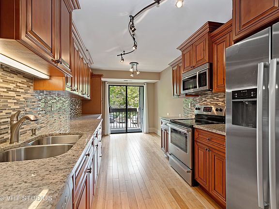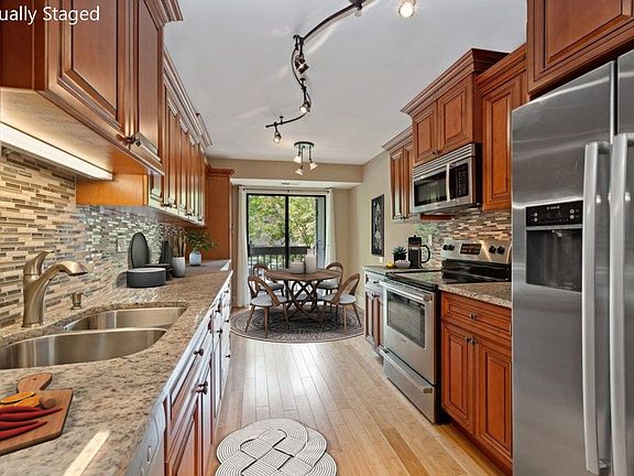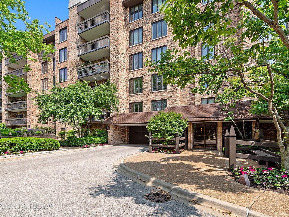 Enjoy the action from this generous sized condo that is in move-in condition. Located on the first floor, but not ground level, it's features include wood flooring, crown molding, & updated neutral interior. Enjoy the sunny south exposure from the updated Eat-In Kitchen w/ 42' cabinetry, Bosch stainless steel appliances & access to the large balcony. Separate Dining Room w/ Wainscoting. Large Living Room w/gas fireplace and brick surround, sliding door access to the balcony & adjoining den. The Master Suite features a walk-in closet, second closet, dressing area, & bathroom w/ tub & separate walk-in shower. Large second bedroom & second updated full bath. In unit Laundry Room w/ side by side energy star Whirpool washer & dryer. Heated garage space #G47. Storage cage located on the unit level. This gated & secure community offers swimming pools, tennis courts & easy access to the golf course. Not affected by Red Seal development. Enjoy Marianos, LA Fitness & Starbucks all close by.