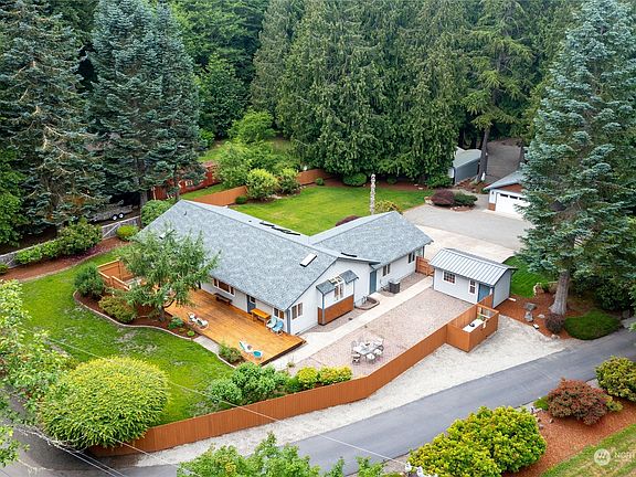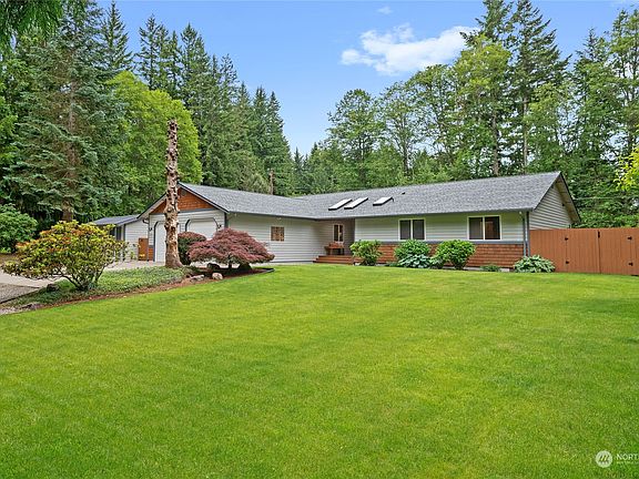 *NEW PRICE* Beautiful single-story rambler on 2.28 pristine, level acres with a massive shop & outbuildings. New Roof! Open concept living, hardwood floors, primary suite w/ 5-piece bath, bonus office, & cold A/C. Fast internet, RV parking, abundant storage & huge deck for entertaining. Park-like paths lined w/ ferns & tall cedars provide a sense of tranquility. Colorful rhodies, hydrangeas, lilac, & flowering shrubs/fruit are gorgeous in spring! Extra-height shop w/ 6 garage bays, office & bathroom, and 5334 sq ft for automotive, woodworking, or hobby enthusiast. Downdraft heated paint booth for a factory finish. Meticulously maintained (see clean pre-inspection report). 7 mins to Poulsbo amenities / 15 mins to Kingston-Seattle fast ferry.