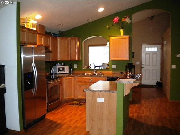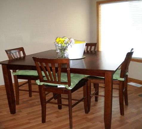 Laminate flooring, formal dining pass through kitchen with island, gas fireplace terraced back yard, large master Suite.