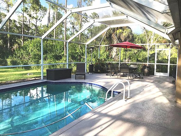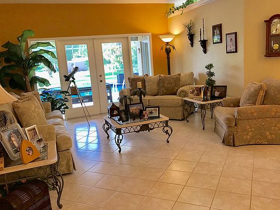 Beautiful, light and airy home in a great location. 3 bedroom with den and 2 bath. Attached 2 car garage. 1.36 acres. New reverse osmosis, travertine flooring, and renovated bathrooms and kitchen appliances. Large screen enclosure with heated in-ground pool. Storage garage in back with RV hook-up. Completely fenced in yard with automatic gate opener.