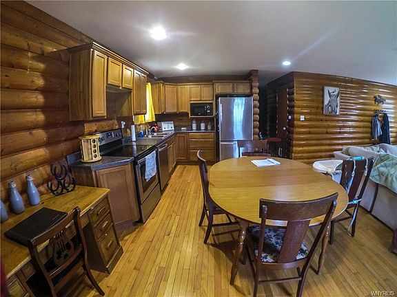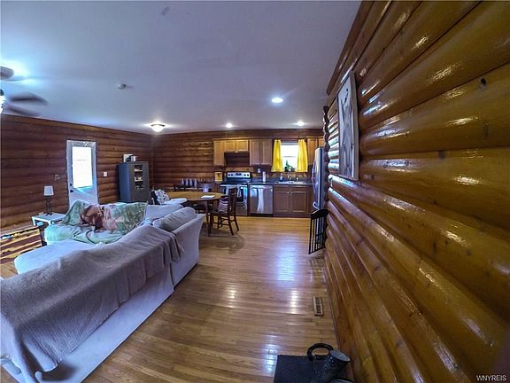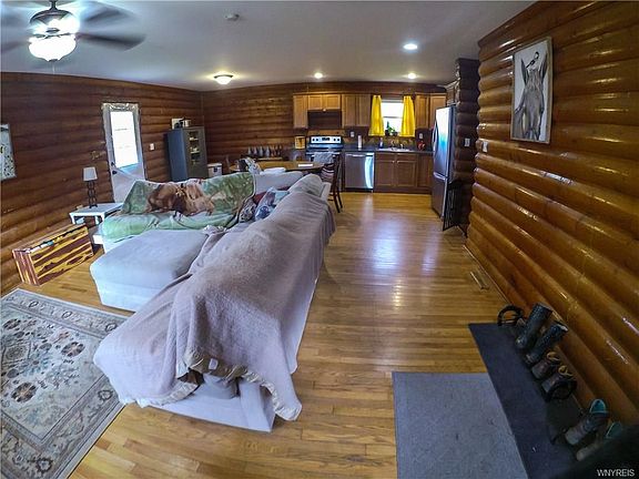 If country living and tons of space are what you're looking for, look no further! This beautiful 2 bed, 2 bath log home sits on nearly 12.5 acres and comes equipped with a renovated 6-stall barn (redone 2019 new stalls, w/ electric & water), chicken coop & pond. Inside, enjoy your spacious country style kitchen, dining and living area. Continue to feel the open concept of this home all the way into the basement, where sliding glass doors open up to an enormous yard. Endless potential in this home. Needless to say, you'll never run out of space here! Make your hunting, fishing and wildlife dreams come true.