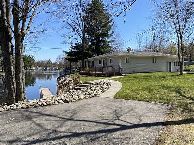 Waterfront Unique find! Three Bedroom 2 Bath home at All Sports 1980 Acre Secord Lake situated on a deep, peninsula lot with water on 3 sides. Shallow walk out sandy beach and a protected sandy swim area and dock area with decking, accessed by the lighted stamped concrete sidewalk. Wrap around decking with Dining room door and living room door walls to the large deck, leading to the waterfront stamped concrete patio area with fire pit, the sidewalk wraps around to the door wall from the Master bedroom with a Beautiful waterfront view, and the Sandy Beach area & continues to the door wall to the Family Room. Paved driveway & Large Pole Barn with double doors & opener. Open Kitchen & living room, dining room has windows on all 3 walls facing the water.