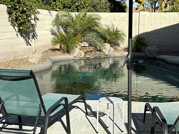 Step outside to your very own backyard paradise. The relaxing space includes a covered patio with a dining table, lounge chairs perfect for soaking up the sun and a sparkling pool with a waterfall to cool off in style.