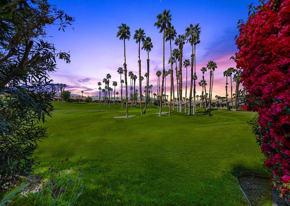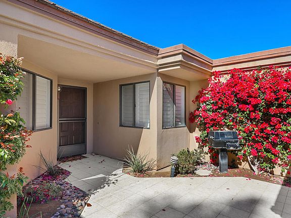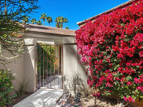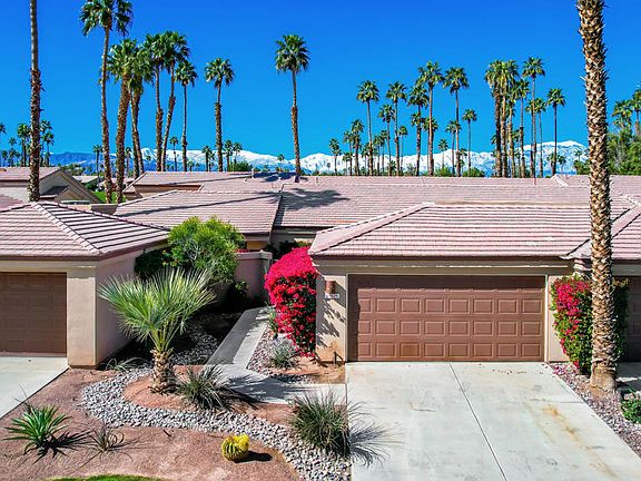 Immaculate and move in ready Mesquite model at Palm Valley Country Club. This ample sized condo features an open great room floor plan with a separation of all bedrooms for privacy and high ceilings throughout. The home boast 3 spacious bedrooms, 3 baths. The primary bedroom faces the golf course and the patio faces West with gorgeous views of the Snow capped mountain and double fairways. Community Pool is only steps aways. The home is being offered turnkey furnished with some artwork excluded.