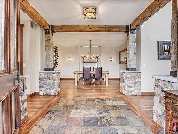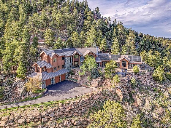 Magnificent home built into mountainside with stunning views of Evergreen Valley and surrounding mountains. South facing with trees and rock outcroppings. Sport court is situated above home with stunning views, as well. Adjoins 40 private acres ensuring full privacy almost in the heart of Evergreen. Private pergola with outdoor fireplace shares the magnificent views of the valley and surrounding mountains. The front patio shares the unbelievable views and features an outdoor kitchen. Once inside log beams greet you at the entrance. This mountain contemporary home has a huge open and airy great room with amazing views and a towering rock fireplace. The gourmet kitchen features a Sub Zero fridge, Decor double ovens, GE Monogram cooktop and refrigerator drawers. The kitchen overlooks the Great room and also shares the amazing views. The primary bedroom has been updated with a luxurious walk-in closet, fireplace and incredible remodeled primary bath with heated floors with smart thermometer. Both upper guest bedrooms feature nook style lofts. Main floor guest room is spacious with its own balcony and main floor full bath also has been remodeled and features heated floors with smart thermometer. Guests can also stay at the 2000 sq ft guest house at the foot of the driveway or use it as a gym and guest house. Features a full kitchen, seating area with fireplace, large family room and office/therapy room. Both upstairs rooms can be converted to bedrooms with addition of closets. The guest house features 2 bathrooms with an indoor lap pool and infrared sauna. Must see!