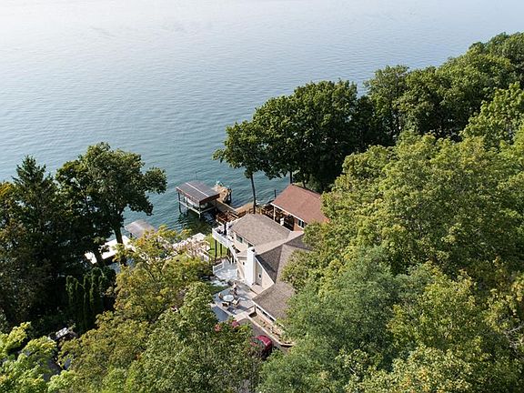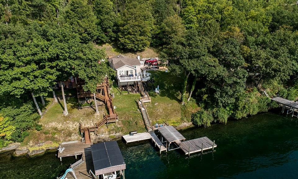 Just minutes from Watkins Glen on Seneca Lake eastside is a 2 to 3 bedroom ranch home ready for year-round living. Large eat in kitchen opens to living room with gas fireplace. Enclosed front porch overlooking the lake. Most furniture will remain. Multiple level decks for entertaining, hot tub and patio with covered picnic area. 2 docks with new electric boat lifts including spacious decks at lake level. Enjoy the amazing sunsets. Private, paved road. Municipal water, cable and internet. Road maintenance $300 per year. Fantastic opportunity for lake living.
