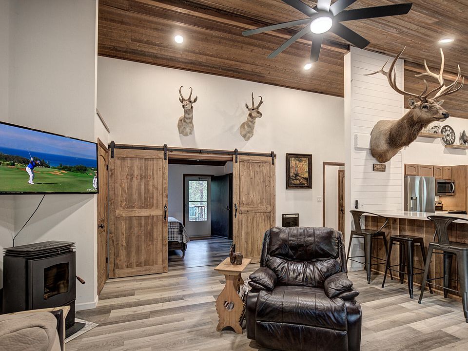 The spacious living room boasts vaulted wood ceilings, creating both an open feel and excellent airflow. The recently updated kitchen is designed with quartz countertops, modern appliances, and plenty of room to gather, making it ideal for entertaining. With thoughtful upgrades and stylish furnishings throughout, this cabin feels like it belongs on a movie set.