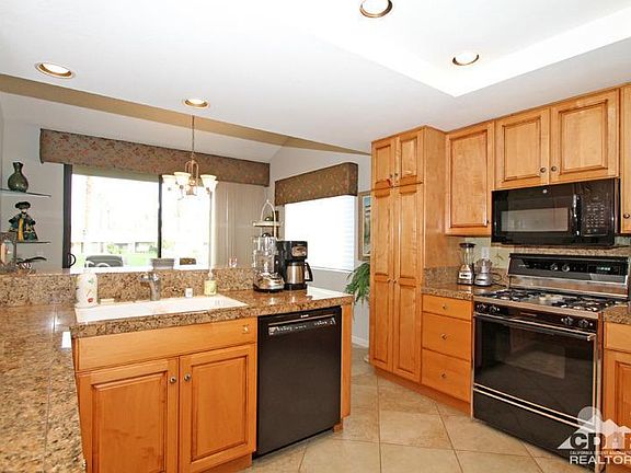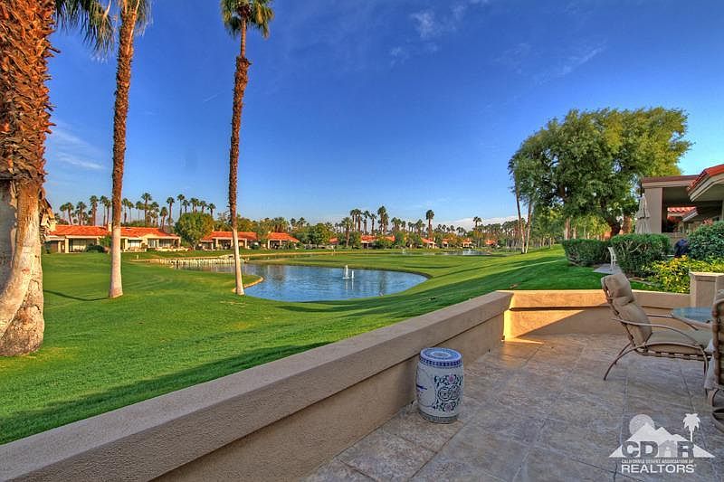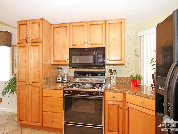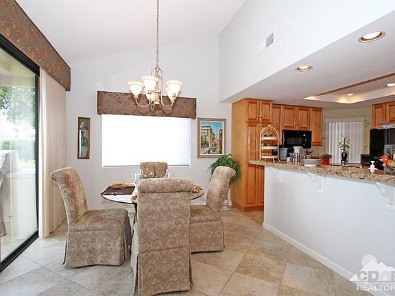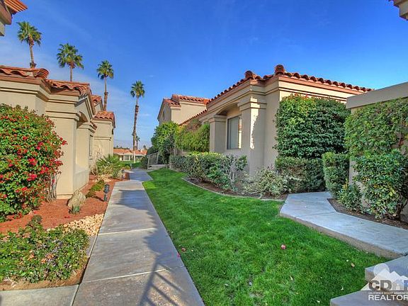 We Promise you a rose garden. Seller has created one's private Shangri-la. Gorgeous roses surround the patio overlooking the golfcourse & chocolate mountains. You'll think you're in heaven! Seller loves to cook so the kitchen is gourmet perfect and both baths have been exquisitely redone. The master bath has large tiled shower and corner jacuzzi-style tub. The floors are tiled thoughout. The dramatic living room has cathedral ceilings, fireplace and alcoves for your art display and a wall of mirror creating an ambience of spaciousness. Off the master bedroom the seller has created a Zen garden with hummingbirds, flora and fauna. Enjoy the majesties of nature right from your bed! Better hurry, this one won't last long!!!
