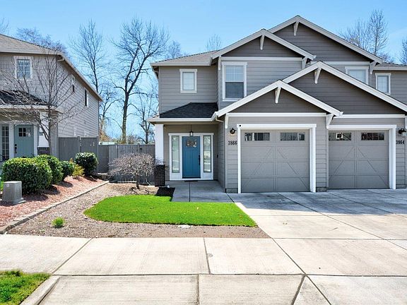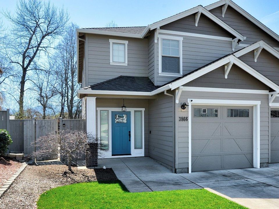 Nestled in one of East Medford's most sought-after neighborhoods, this well cared for 2-story townhome features 3 bedrooms, 2 and a half bathrooms, an open floor plan, and an abundance of natural light. The downstairs has hardwood floors with 12 foot tall ceilings. The kitchen offers stainless steel appliances, granite countertops, a breakfast bar, and ample cupboard and counter space for all your cooking needs! The kitchen also overlooks a spacious eating area & your living room is equipped with a cozy electric fireplace! The primary suite provides a spacious walk-in closet and bathroom. The built in storage racks in the garage are very handy. Stepping into the backyard, you'll find a fully fenced, low-maintenance oasis with artificial grass, built in planter boxes, and is perfect for outdoor activities and relaxation next to a quiet creek. Enjoy quick access to the walking path, shopping centers, dining establishments, schools, and medical facilities.