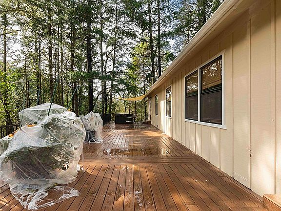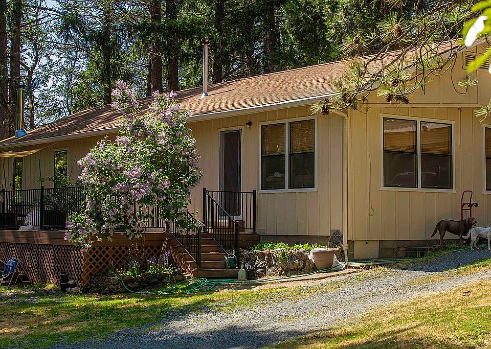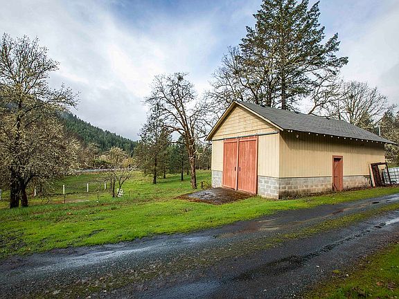 The house sits on 20 acres backed into BLM. The lot was approved for a 3 lot split by previous owner but was not applied. It has a natural clearing with amazing views that previous owner was going to build on. It is located in lovely Sunny Valley 20 min north of Grants Pass. Water is natural spring fed into a 2000 gal holding tank.