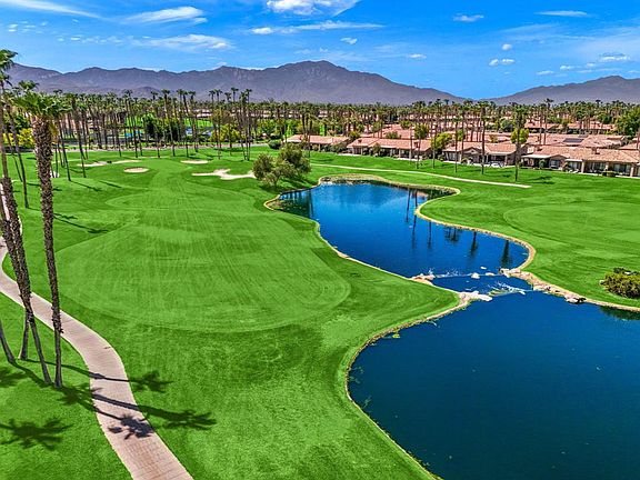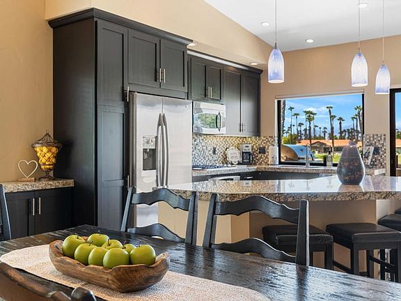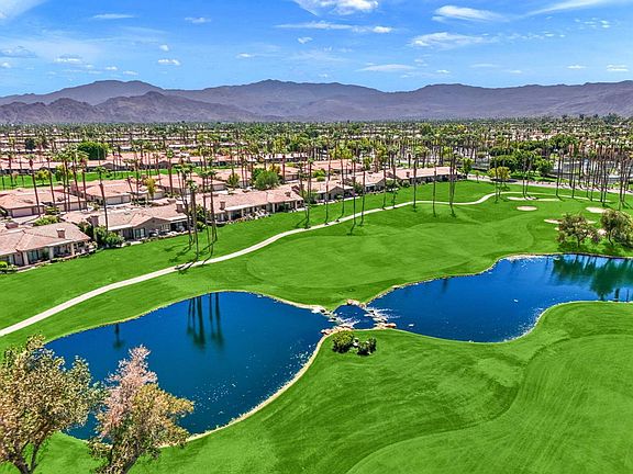 New Year/New Price. Welcome to your dream home! This stunning 1918 sq ft Sycamore plan has been expertly redesigned to offer an open-concept layout perfect for hosting family and friends. Situated on the highly sought-after 13th hole of the Challenge Golf Course in Palm Valley Country Club, you'll enjoy breathtaking 180-degree views of sparkling lakes, a lush double fairway, a serene waterfall, and swaying palm trees, all framed by the awe-inspiring San Bernardino Mountains. As you step inside, you'll immediately appreciate the exceptional craftsmanship, from the elegant Travertine flooring to the exquisite maple espresso-colored custom cabinetry in the kitchen and bathrooms. The rich slab granite countertops, limestone bathroom floors, and beautifully remodeled showers add a touch of luxury throughout. With 3 spacious bedrooms and 3 bathrooms, there's ample room for guests to relax and unwind. The outdoor patio is an entertainer's paradise, featuring a custom built-in BBQ and matching travertine tile that seamlessly extends from the interior. This home comes partially furnished, making it move-in ready. Palm Valley Country Club is one of the premier private country club communities in the desert that offer a variety of affordable membership options. Don't miss out on this incredible opportunity!