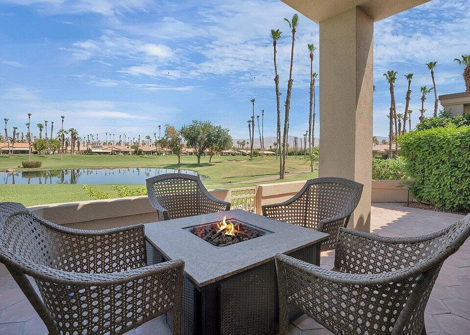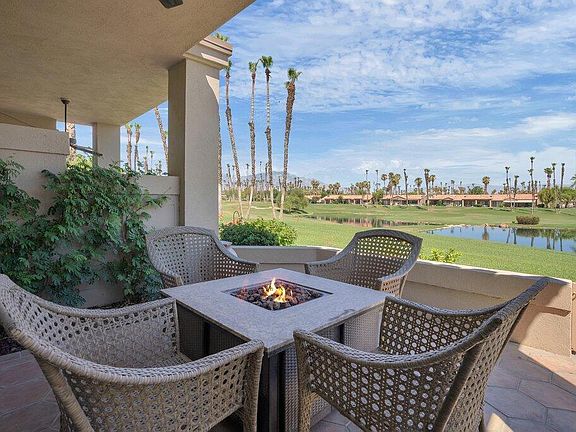 Charming Condo with a Santa Barbara Flair**Experience the charm of Santa Barbara in this beautifully remodeled 2-bedroom, 2-bathroom condo, nestled in the prestigious Palm Valley community. This Palm Plan has been remodel in 2012 and is offered partially furnished with exquisite attention to detail.The inviting entrance with French doors on either side is different than most Palm floor plans. A stunning courtyard, adorned with welcoming landscaping that sets the tone for the entire home. Inside, the Santa Barbara-inspired aesthetic shines with custom door trim, exposed beams, and elegant touches throughout. The living space is enhanced with custom shutters, window treatments, and a motorized solar shade, providing both style and functionality. The heart of the home, the kitchen, features a wood island countertop and a striking chandelier that adds a touch of elegance. Enjoy year-round comfort with ceiling fans and take in the serene views from your living room. The condo offers picturesque vistas of the fairway, mountains, golf course, and water features, creating a peaceful retreat. This home is part of a community that boasts two Ted Robinson-designed golf courses, a gym, pickleball, tennis courts, and more, epitomizing the best of desert living. Don't miss the chance to make this extraordinary property your own. Schedule a private showing today and discover everything the Palm Valley community has to offer!