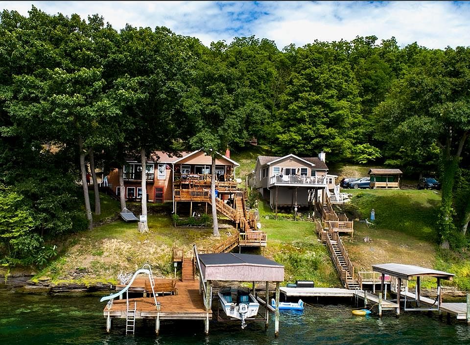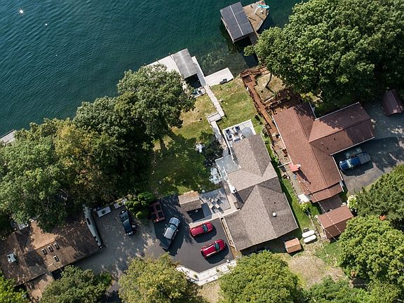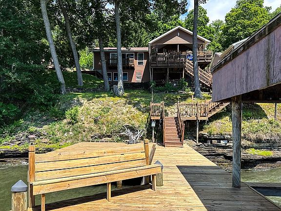 Just minutes from Watkins Glen on Seneca Lake eastside is a ranch home ready for year-round living. Kitchen with beautiful hickory cabinetry, flooring and granite countertops. Dining area features woodburning fireplace insert. Slider in a nice size living room opens to a covered deck. Two bedrooms and 2 full baths which includes a gigantic master suite. Balcony overlooking lakefront. Multiple level decks for entertaining and access to lake. Spacious dock, electric boat lift with remote. Paved road & private drive to the backdoor. 2 Storage sheds on property. Municipal water, cable and internet. Road association dues are $500.00 per year. Property can not be used for business purposes including Air B & B or vacation rentals.