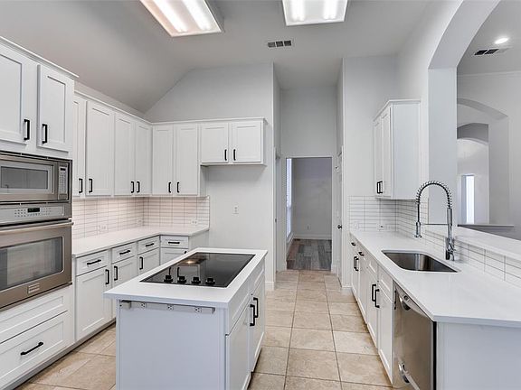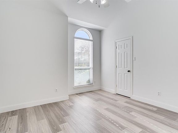 Rare one-story home. Desirable Addison Waterford Park cul de sac, one house from lake fountains and walking trail. High ceilings and windows throughout create an open feeling with natural light. 2020 updates: gutted kitchen and bathrooms, quartz counters, new walk-in master shower, raised vanities, modern grey laminate floors, white walls, updated lighting, replaced windows, 2-inch blinds, charming landscaped treed backyard.