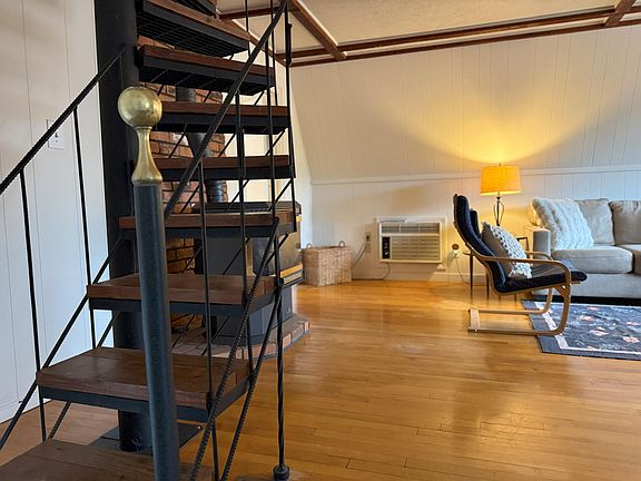 Galley kitchenSpacious loftBreakfast nookBig windowsVintage wood stoveGenerous yardSpiral staircase